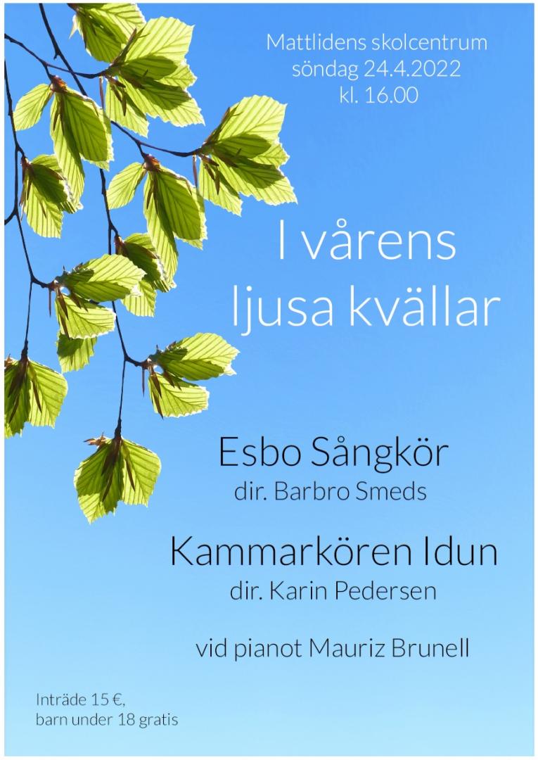 Esbo Sångkör, dir. Barbro Smeds och gästande Kammarkören Idun, dir. Karin Pedersen. Vid pianot Mauriz Brunell.