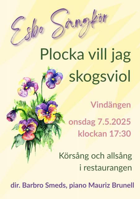 Vårkonsert i Mattlidens skolcentrum söndag 24.4.2022 kl. 16:00 med Esbo Sångkör, dir. Barbro Smeds, och gästande Kammarkören Idun, dir. Karin Pedersen. Vid pianot Mauriz Brunell.